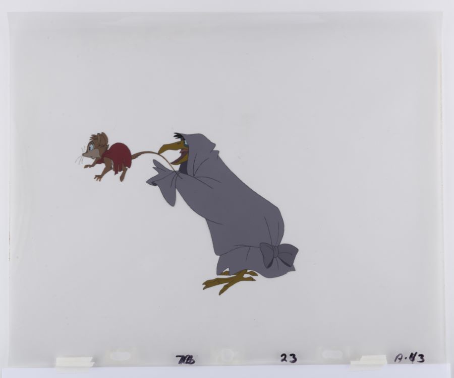 A multi-layer production cel from the Don Bluth Studios animated film “The Secret of NIMH” (1982). Featuring Mrs. Brisby and Jeremy covered in laundry, the hand-painted cel was created at the studio and used during the animation process. The piece is an actual frame of animation that was photographed and appears in the film. Measuring 13.5”x16.5” overall, with an image size of 6.25”x8.25”, the cel is in very good condition with minor surface wear, slight line fade, light adhesive residue to the sides, and paper stuck to the reverse of the paint. The cel is paired with a color printed reproduction background for presentation purposes.